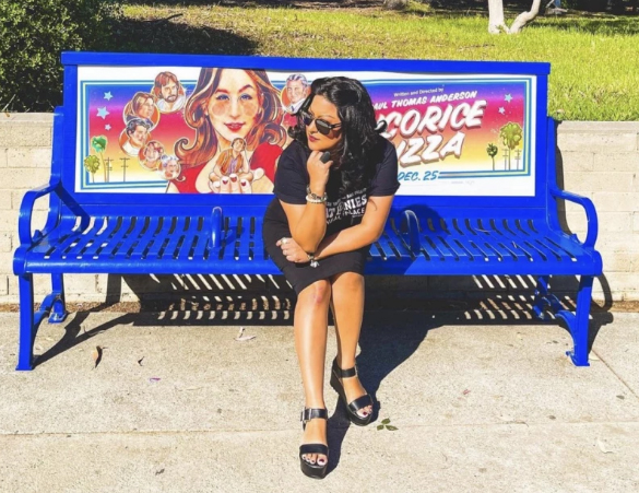 Kat Reeder sentada en el mismo banco donde durmió su padre con el cartel de «Licorice Pizza», obra original suya